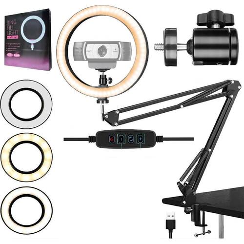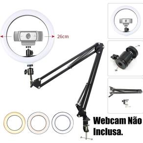 Ring light aro luz de led iluminador hing + suporte mesa pedestal bancada braço articulado webcam universal 1/4 estúdio