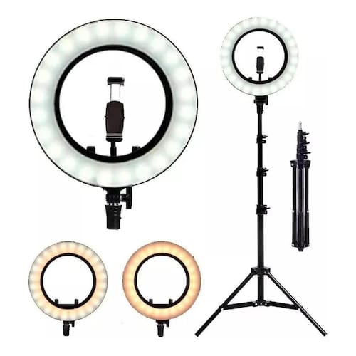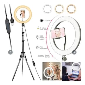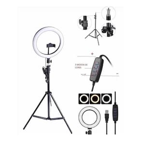 Ring Light Completo Portátil 26cm + Tripé 2m Ring Light Led Completo Iluminador Portátil 26cm Tripé 360º Alimentação via USB Ligue em computadores, note books, etc Poderá ligar em fontes de celulares fonte não inclusa . Descrição: - , com caixa , embalagem segura. -utilize o botão LIGA/DESLIGA para acionar as luzes, botão + e - para mudar a intensidade das luzes , o botão atualize para mudar o tom das luzes. -O Iluminador Ring Light de 10 polegadas 26 cm, desenvolvido para maquiadores, fotógrafos, cinegrafistas , youtubers , jovens , crianças ,adultos etc... com ele é possível fazer ótimos videos , fotos com iluminação perfeita , para quem procura o máximo em qualidade, utilize onde quiser , sendo portátil e de fácil manuseio . Características: Cor : Preto Diâmetro externo: 26 cm / Diâmetro interno: 20 cm Potência : 25 w Voltagem : BIVOLT USB : cabo de alimentação / comprimento 180 cm Material: liga de alumínio/ABS Fonte de luz: LED Lâmpadas de LED: 64 Forma: Anel Tripé compacto e ajustável 2,10 m Att SHOP AMS. Marca: Não Informado