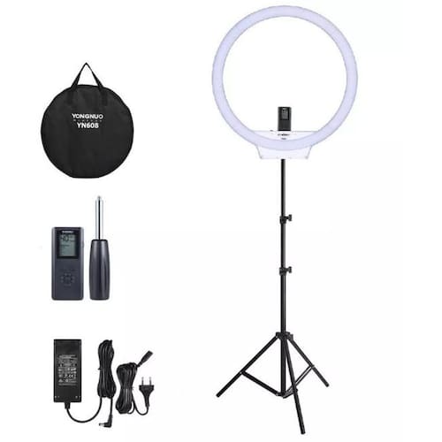 O Iluminador de Led do tipo Ring Light anel de luz da Yongnuo modelo YN608 é uma fonte de luz , muito potênte e de qualidade superior. Possui entrada para encaixe de tripé ou qualquer acessório universar com o pino 1/4'' de tripé, além disso está incluso em seu pacote um suporte de mão garra muito útil para utilização em assuntos móveis como em gravações de vídeos. O Ring Light Yongnuo YN608 é um iluminador muito popular no mundo fotográfico devido sua grande qualidade e por ser uma das melhores soluções de iluminação moderna da última geração. Uma iluminação que se destaca também pelo visual único e atraente do reflexo circular nos olhos do modelo, que ilumina os olhos vermelhos e distorções de flashes. O YN608 da Yongnuo é Bi-color, o que permite que utiliza tanto a luz fria quanto a luz quente para iluminar os seus trabalhos, a regulagem de intensidade e cor da iluminação pode ser feita fácilmente e remotamente através do controle remoto do Ring Light. O controle permite que você controle o iluminador a distância, como desligar e liga-lo, ajustar cor e intensidade, etc. Além de estúdios fotográficos profissionais, gravações de vídeos, entre outros produtores de conteúdo visual, o Ring light Yongnuo também é um iluminador indispensável para salões de beleza e estética, para maquiadores, cabelereiros, etc. Além de auxiliar perfeitamente no processo do trabalho destes profissionais, ele também irá ajudar a exibir da melhor forma possível os resultados dos mesmos, agragando muito mais valor ao trabalho realizado. Especificações do Ring Light Yongnuo YN608: Fonte de luz 608 LEDs. Vida de lâmpada de 50,000 horas. Classificação 36,5 W. Gama de cores 3200 a 5500K. Cri =95. Saída de tensão de operação: 8 V, 5 A via adaptador de Ac. Compatibilidade da bateria usa 2 x baterias Np-F de ions de lítio não inclusa . Dimmer: Sim. Montagem alça incluída. Dimensões 20,6 de diâmetro x 1,7 de profundidade 525 x 45 mm . Peso 4,0 lb 1,8 kg . Especificações da Fonte de alimentação: Bivolt 110v - 220 12v 6a.