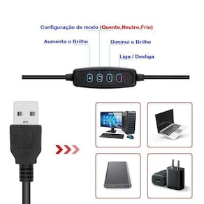 Iluminador De Led Com Tripe Ring Light Usb 16cm 3500k 5500k Iluminador Ring Light de 16 centímetros 6,5 polegadas , desenvolvido para maquiadores, fotógrafos, cinegrafistas e etc, que buscam uma ótima maneira de iluminar com perfeição. Você pode ajustar o ângulo da iluminação por possuir um suporte articulado. É possível controlar as diferentes temperaturas de cores através do controle de ajuste que vai de 3500k à 5500k. Na frente dos leds tem um filtro difusor para suavizar a luz espalhando a luz com maior uniformidade. A alimentação do iluminador é através de cabo USB você pode utilizar um adaptador de tomada de celular para ligar ou conectar no USB do computador ou outro equipamento que forneça 5v USB. O cabo USB deverá estar sempre ligado para funcionar. O encaixe do Ring ligth é através de encaixe padrão de tripés de rosca. O mini tripé também serve para utilizar em outros equipamentos de até 1kg de peso, como projetores, celulares e etc. É recomendado e extremamente eficaz para a macro fotografia, fotografia médica, odontológica, científica, hobby e para a iluminação/fotografia de produções de maquiadores. Fácil de usar, durável e de pouco peso, facilitando o transporte. Especificações: Diâmetro : 16 cm Alimentação: 5v USB Comprimento aproximado do cabo: 1,90m Temperatura de cor: 3200k - 5500K ajustável Ângulo Regulável: