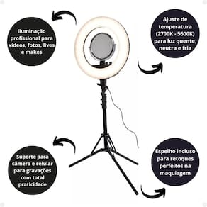 Ring Light Klass Vough Kv Digital Ref. Rl-002 O KV Ring Light Digital Klass Vough é a escolha perfeita para quem busca iluminação profissional para vídeos, fotos, lives e maquiagem! Com 480 LEDs, potência de 90W e ajuste de temperatura de cor de 2700K a 5600K, ele garante luz uniforme e de alta qualidade para todas as suas produções.