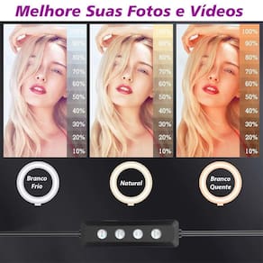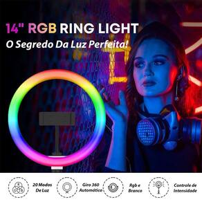 Ring led colorido 36cm 14 polegadas , com 3 suportes trip é Anel luz 14 polegadas rgb O ring light led rgb possui seis tipos de núcleos, tem três opções de temperatura de núcleos e 10 opções de intensidade da cor, podendo ser alternados direto sem controle de iluminação, os efeitos podem ser de acordo com mundos de recaimento. Tamb ém possui as cores tradicionais -branco -branco frio -branco quente Com o ball head em rotativa de 360 graus para fácil de ajustar o ângulo de luz desejado Sua alimentação é através do usb que pode ser em máquina de computador, laptop, banco de energia móvel ou ligado na tomada com de um adaptador de celular não acompanha O ring light para perfeito para streaming , estudos, fotos, vídeo, filmagem e muito mais. Características do produto: Sim. Possui controle remoto com controle das núcleos e efeitos desejados seus ambientes, vídeos e fotos; Sim. Possui trip é de 2,10 cm de altura, super resistente que pro Proporciona maior estabilidade para equipamento; Não é articulavel para os lados, apenas para cima e para baixo. Est á incluso tamb ém o suporte pra colocar o celular no meio dá luz Dimerizável: sim Tamanho do anel luz: 36cm - equivalente a 14 polegadas Possui suporte para celular: sim 1 Itens incluem: 1 anel luz 14 polegadas 36cm 1 tripe profissional com 2,10m de altura 1 cabeça de bola permite rotação de 360º do anel 1 suporte para celular Marca: Não Informado