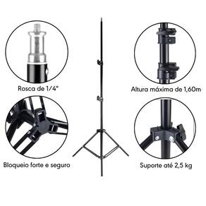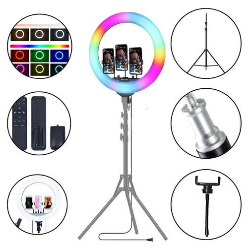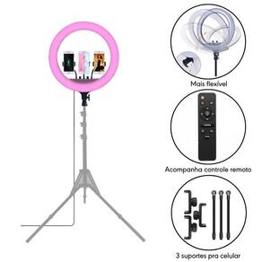 Ring Light LED RGB 45cm Completo com Controle e Tripé Iluminação de Estúdio 1,60m O Ring Light LED RGB de 55W, com 45cm de diâmetro e conexão USB, vem com 3 suportes para celular. Ele possui 480 LEDs de alta qualidade, com brilho ajustável 10-100% e temperatura de cor de 2700K a 6500K. Ideal para fotos e vídeos, oferece vários modos de luz RGB como piscante e movimentos circulares em todas as cores dentre outros diferenciais, também vem com controle remoto para acionar cada uma das funções. O tripé de 1,6m é um acessório versátil e resistente, ideal para estúdios fotográficos e uso com equipamentos de até 2,5kg. Ele possui uma altura ajustável de 54cm a 160cm, com uma rosca padrão de 1/4 na parte superior, compatível com vários tipos de iluminadores e flashes. Especificações: Ring Light Diâmetro: 18 = 45cm Luz: RGB / Fria / Quente / Natural Leds: 480 peças de Alto Brilho Temperatura de Cor: 2700K-6500K CRI: Ra 90 Potência máxima: 55W Lumens: 4800LM Brilho ajustável: 10-100% 10 níveis Tensão de entrada: 5V Frequência: 50-60HZ Rotação de 360 graus para ajuste de vários ângulos Suporte SmartPhone: Para SmartPhone de 5.7 a 8.0 centímetros Tripé Cor: Preto Altura mínima 54cm Altura máxima 160cm Seções: 3 Montagem Rosca de 1/4 Material: Alumínio Itens Inclusos: 1x Ring Light LED RGB Iluminador 45cm 1x Controle 3x Suporte para Celular 1x Tripé de Iluminação 1,6m.