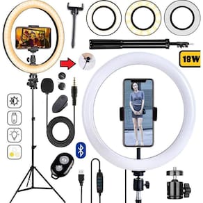 Ring light profissional anel led iluminação completo tripé suporte celular hing make selfie controle bluetooth microfone Kit original com nota fiscal eletrônica Kit ring light + tripé 2,10m + microfone lapela ((((( acompanha controle disparador bluetooth ))))) Com este modelo você consegue usar o celular tanto na vertical quanto na horizontal Possui também ball head (permite rotação de 360º do ring) Iluminador ring light de 26 centímetros, desenvolvido para maquiadores, fotógrafos, cinegrafistas e etc, que buscam uma ótima maneira de iluminar com perfeição. Ring light led é um iluminador com ajuste de até 10 níveis de intensidade de luz, 03 tonalidades de cor, quente, fria e mesclada (quente e fria ao mesmo tempo), alimentado através de um cabo usb, devendo estar sempre conectado a uma fonte de energia para acender. A base composta por um tripé, um encaixe articulado, o que possibilita fácil ajuste de altura e do ângulo que deseja posicionar sua luz. Todas as peças são encaixadas através de rosca. Aviso: entrada usb do produto é compatível com fonte/carregador de celular Características: - alimentação: usb - voltagem: bivolt - tipos de luz: quente, fria e mesclada. - temperatura da cor: 3500k / 6500k - dimensões aproximadas do led (axlxp): 26x26x1,5cm - altura aproximada do tripé com encaixe articulado: 15cm - material do tripé: ferro - tamanho aproximado do cabo: 1,5m - cabo com controle de liga/desliga, tipo de cor e intensidade de luz. Informações técnicas: - 10 níveis de intensidade de luz - 03 tipos de tonalidade de luz (quente, fria e mesclada) - suporte articulado - tripé com ajuste de altura Está incluso também o suporte pra colocar o celular no meio do ring light Microfone de lapela profissional para profissionais exigentes que buscam melhorar a qualidade seus vídeos sem um alto investimento. Microfone para uso em celulares sem necessidade de uso de adaptadores. Características: - alta sensibilidade, alta dinâmica, ampla resposta de freqência. - clipe giratorio permite que você prenda facilmente em sua gola, gravata ou no bolso. - uma tampa de espuma protege seu microfone do ruído do vento e cuspir. - portátil com tamanho de cabo de 1,5 metros. - ótimo para áudio na gravação de vídeos, entrevistas , podcasts... Controle remoto bluetooth celular É um produto que foi desenvolvido para facilitar a vida dos usuários de smartphones que adoram tirar aquela selfie sozinho ou com a galera. Com ele, você pode facilmente tirar fotos ou fazer vídeos sem precisar tocar no seu aparelho Atenção a cor do controle bluetooth é escolhida aleatoriamente, conforme a disponibilidade em estoque Itens inclusos: (1) ring light 10 polegadas (26cm) (1) tripé profissional com 2,10m de altura (1) ball head (permite rotação de 360º do ring) (1) suporte para celular (1) controle de intensidade e troca de temperatura (embutido no fio) (1) microfone de lapela profissional (1) controle bluetooth para fotos e vídeos Melhor kit custo benefício.