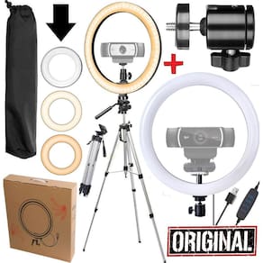 Ring light profissional iluminador anel led luz tripé grande + suporte para webcam lives vídeo aula estúdio home office Garantia total de nossos produtos,pois são testados antes do envio. ring light led 10 polegadas + tripé com ajuste de altura até 1,30 metros luz com 3 modos de cores e 10 níveis de intensidade suporte ball head 360º possibilita ajuste em vários angulos do dispositivo de gravação acompanha suporte para webcam Itens inclusos: 1x ring light led 26cm 1x ball head 360º 1x suporte para celular 1x tripé telescópico 1x bolsa para tripé Iluminação de led para estúdio, home estúdio, ring light 10 polegadas, com adaptador ball head 360º que permite ajuste de angulação do dispositivo de gravação. Iluminação regulável 3 cores e 10 níveis de intensidade de luz lâmpada anel + controle de iluminação + ball head 360 graus. Iluminador ring light 10 polegadas, desenvolvido para maquiadores, fotógrafos, cinegrafistas e etc, que buscam uma ótima maneira de iluminar com perfeição. Com ajuste de ângulo com suporte articulado. Com controle de temperatura e da cor da lâmpada. Ligado através de cabo usb Você pode utilizar um adaptador de tomada de celular para ligar ou conectar no usb do computador ou outro equipamento que forneça 5v usb. O cabo usb deverá estar sempre ligado para funcionar. Características: - alimentação: usb - voltagem: bivolt - tipos de luz: quente, fria e mesclada. - temperatura da cor: 3500k / 6500k - dimensões aproximadas do led axlxp : 26x26x1,5cm - tamanho aproximado do cabo: 1,5m - cabo com controle de liga/desliga, tipo de cor e intensidade de luz. Informações técnicas: - 10 níveis de intensidade de luz - 03 tipos de tonalidade de luz quente, fria e mesclada Tripé telescópio universal - muito prático e útil com acabamento excelente e bolsa para transporte. - fabricado em alumínio; travas para fixação da posição - sistema de rosca compatível com câmeras, suportes para celular, iluminadores de led etc - pés em borracha e ajuste de terreno para melhor estabilidade - altura mínima: 45 cm - altura máxima: 1,30 mts com o ring light - base pode ficar na posição horizontal ou vertical Importante: Kit acompanha uma unidade de cada item Não acompanha webcam ou outros dispositivos Postamos em até 24 horas úteis.