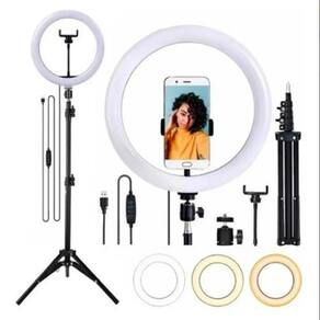 01- ring light 26cm 01- controle de brilho 01- tripé de 2.1m 01- suporte para celular (celular tanto na horizontal como na vertical).