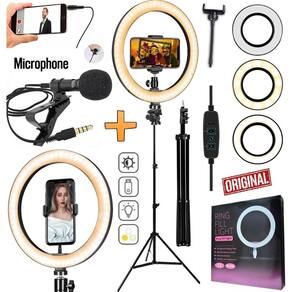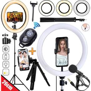 Ringlight 26 cm led celular tripe microfone luz para selfie blogueiro filmagem youtuber controle bluetooth foto e vídeos Kit com eletrônica Kit ring light + tripé 2,10m + microfone lapela + acessórios acompanha controle disparador bluetooth com este modelo você consegue usar o celular tanto na vertical quanto na horizontal Possui também ball head permite rotação de 360º do ring O melhor kit e mais completo para gravação e lives O kit com iluminador profissional com tecnologia led ideal para fotografia, vídeo, fotografia odontológica, maquiagem e estética. Se adapta a qualquer necessidade de iluminação, luz linear e sem sombras. Iluminador ring light de 26 centímetros, desenvolvido para maquiadores, fotógrafos, cinegrafistas e etc, que buscam uma ótima maneira de iluminar com perfeição. Ring light led é um iluminador com ajuste de até 10 níveis de intensidade de luz, 03 tonalidades de cor, quente, fria e mesclada quente e fria ao mesmo tempo , alimentado através de um cabo usb, devendo estar sempre conectado a uma fonte de energia para acender. A base composta por um tripé, um encaixe articulado, o que possibilita fácil ajuste de altura e do ângulo que deseja posicionar sua luz. Todas as peças são encaixadas através de rosca. Aviso: entrada usb do produto é compatível com fonte/carregador de celular Características: - alimentação: usb - voltagem: bivolt - tipos de luz: quente, fria e mesclada. - temperatura da cor: 3500k / 6500k - dimensões aproximadas do led axlxp : 26x26x1,5cm - altura aproximada do tripé com encaixe articulado: 15cm - material do tripé: ferro - tamanho aproximado do cabo: 1,5m - cabo com controle de liga/desliga, tipo de cor e intensidade de luz. Informações técnicas: - 10 níveis de intensidade de luz - 03 tipos de tonalidade de luz quente, fria e mesclada - suporte articulado - tripé com ajuste de altura está incluso também o suporte pra colocar o celular no meio do ring light Microfone de lapela profissional para profissionais exigentes que buscam melhorar a qualidade seus vídeos sem um alto investimento. Microfone para uso em celulares sem necessidade de uso de adaptadores. Características: - alta sensibilidade, alta dinâmica, ampla resposta de freqência. - clipe giratorio permite que você prenda facilmente em sua gola, gravata ou no bolso. - uma tampa de espuma protege seu microfone do ruído do vento e cuspir. - portátil com tamanho de cabo de 1,5 metros. - ótimo para áudio na gravação de vídeos, entrevistas , podcasts... Controle remoto bluetooth celular É um produto que foi desenvolvido para facilitar a vida dos usuários de smartphones que adoram tirar aquela selfie sozinho ou com a galera. Com ele, você pode facilmente tirar fotos ou fazer vídeos sem precisar tocar no seu aparelho O mini tripé tripod support é recomendado para usuários que buscam um produto versátil e que permita a criação de fotos e vídeos de vários ângulos garantindo estabilidade para sua imagem. Isto, porque sua é constituída por uma cabeça que permite a utilização do celular tanto no sentido horizontal como vertical. Atenção a cor do controle bluetooth é escolhida aleatoriamente, conforme a disponibilidade em Itens inclusos: 1 ring light 10 polegadas 26cm 1 tripé profissional com 2,10m de altura 1 ball head permite rotação de 360º do ring 1 suporte para celular 1 controle de intensidade e troca de temperatura embutido no fio 1 microfone de lapela profissional 1 controle bluetooth 1 mini tripé de mesa para celular e câmera Melhor kit custo benefício. Postamos em até 24 horas úteis.