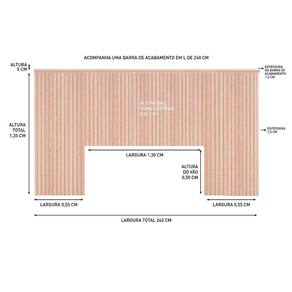 Cabeceira ripada com medida total instalado de 135cm de altura e 240cm de largura. Produto vendido em ripas, sendo elas 22 ripas com altura de 135cm para as laterais da cabeceira, e 26 ripas com altura de 0,85cm para o centro da cabeceira.