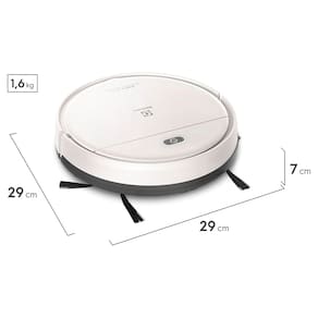 As duas escovas laterais alcançam cantos e bordas, capturando poeira e pelos, enquanto a função MOP passa pano seco para um acabamento polido. O filtro HEPA Allergy Protect remove ácaros, poeira fina e alérgenos, devolvendo ar mais puro. O sensor antiqueda infravermelho detecta desníveis, garantindo navegação segura em casas com escadas ou varandas. Design e Praticidade Com 7 cm de altura e design ultraslim, o ERB11 acessa áreas de difícil alcance, como sob móveis, e é fácil de guardar. Seu peso leve (2,6 kg) e diâmetro de 28 cm facilitam o manuseio. O reservatório de pó removível simplifica a limpeza, e a bateria de lítio recarregável oferece até 2h20 de uso contínuo, cobrindo até 100 m² em uma única carga (dependendo do ambiente). O sistema bivolt (100-240V) garante compatibilidade com diferentes redes elétricas, e o carregador (incluso) recarrega em cerca de 4 horas. O nível de ruído de 70 dB é comparável a um secador de cabelo, aceitável para uso diário.