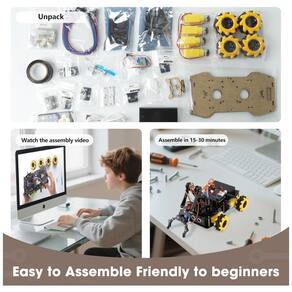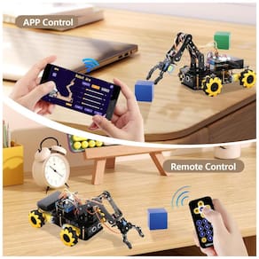 O braço robótico 5DOF montado sobre o chassi possibilita pegar, erguer e posicionar pequenos objetos, explorando conceitos de cinemática simples, coordenação de movimentos e controle em múltiplos eixos. O kit é acompanhado de cerca de 16 tutoriais com vídeos de montagem que orientam desde a construção mecânica com parafusos padronizados até a escrita de códigos para controle de deslocamento do carro, movimentos do braço e rotinas combinadas.