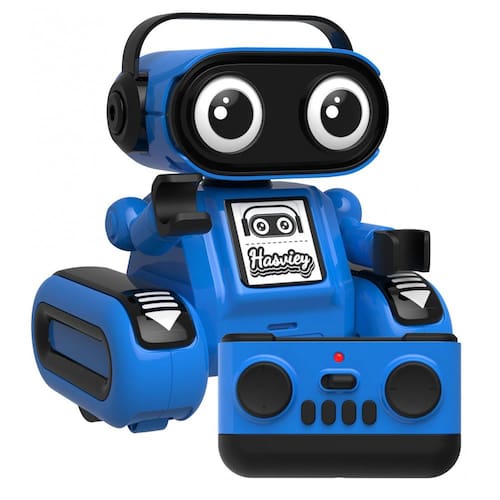 O robô Hasviey é um brinquedo eletrônico recarregável com controle remoto, indicado para crianças a partir de 3 anos, formado por duas partes: a unidade superior com cabeça e braços articulados e a base com rodas para deslocamento. Os olhos em LED acendem ao ligar o robô e podem ser ajustados para diferentes modos de iluminação pelo controle, enquanto a base realiza movimentos para frente, para trás, rotações e giros de 360 graus. O modo de demonstração automática aciona sequências de dança combinadas com música, transformando o uso em uma atividade de movimento e ritmo.