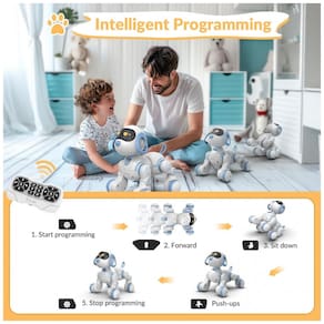 O modo de programação permite registrar uma sequência de movimentos, como andar para frente, para trás, virar à esquerda e à direita, que são reproduzidos na ordem definida pela criança. O robô possui danças e músicas integradas, podendo executar diferentes coreografias quando acionado pelo controle, com olhos em LED que reforçam a expressão visual durante os movimentos. A articulação na região da cintura permite imitar poses típicas de animais, aumentando as possibilidades de gestos durante a brincadeira.