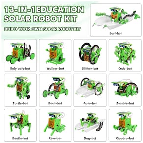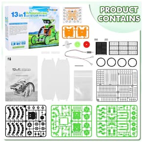 Este kit educacional permite que as crianças construam 13 tipos diferentes de robôs, que podem se mover em terra e água, seguindo um manual passo a passo. Inclui peças móveis e de conexão como engrenagens, placas, pneus e eixos, que podem ser facilmente desmontadas após cada construção.