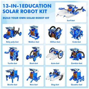 Este kit educacional permite que as crianças construam 13 tipos diferentes de robôs, que podem se mover em terra e água, seguindo um manual passo a passo. Inclui peças móveis e de conexão como engrenagens, placas, pneus e eixos, que podem ser facilmente desmontadas após cada construção.