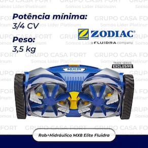 Robô Hidráulico Automático de Limpeza para Piscina MX8/MX9 FLUIDRAAspira e esfrega todas assuperfícies da sua piscina. Indicado para piscinas até 12 x 6 metros.VANTAGENS:Limpeza de bordas: Escovação dupla que garante uma eficiente limpeza da linha dágua;Max-drive NAVIGATION: Sistema de navegação para uma limpeza uniformeVálvula reguladora de fluxo: Controla automaticamente o excesso de fluxo para melhor performance.Escovas removíveis: Fácil reposição.Fácul Encaixe: Mangueiras duráveis e de fácil encaixe;Operação com motobombas a partir de CVEficiente mesmo com baixo fluxo: Projetado para trabalhar com bomcas de velocidade variáveis;Para piscina de até 10 x 5 metrosSistema de escovação giratória.O aspirador MX8 possui o sistema de navegação X-Drive para limpar todas as áreas da piscina.O seu sistema de deslocamento por correias tornam muito estável e aderente.Este aspirador de piscina hidráulico tem 2 hélices de sucção com escovas e uma poderosa turbina de sucção.É ideal para a limpeza de piscinas enterradas privadas e piscinas externas com paredes rígidas de até 12 x 6 m.Tipos de Piscinas:Formas: Rectangulares, ovais e formas livres.Fundos: Plano, inclinação suave e declive composto.Revestimentos: Azulejo, liner, revestimento de poliéster, PVC armado, cimento pintado.Tamanho da piscina: Até 12 x 6 m.Acessórios incluídos:Mangueiras Twist Lock.Adaptador cónico.Alargado 45.Cotovelo 45.Regulador de fluxo automático.Válvula de regulação automática de fluxo skimmer .Características Gerais do Aspirador Zodiac MX8Ciclo de limpeza: Recomenda-se uma filtração de 6h em 3 ciclos de 2 h.Área de limpeza: Fundo e paredes.Deslocamento: Aleatório.Fonte de energia: Equipamento de filtração da piscina.Instalação: Pelo usuário na tomada do aspirador ou no skimmer.Sistema de funcionamento: Aspiração mecânica: turbina de aspiração.Tipo de resíduos aspirados: Finos e médios.Características Técnicas do Aspirador Zodiac MX8/MX9:Comprimento da mangueira: 12 secções de 1 m.Medidas: 41 x 19 x 22 cm C x L x A .Medidas da embalagem: 102 x 23 x 37 cm C x L x A .Capacidade de filtração: Circuito de filtração da piscina.Velocidade de deslocamento: 8 m/min.Potência mínima requerida da bomba de filtração: 3/4 HP 1 CV para piscinas de azulejo .Peso: 3,5 kg.Cobertura de limpeza: 36 cm.Garantia: 1 ano.Marca: FluidraGarantia: 12 meses