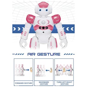 Este robô inteligente pode ser controlado tanto por um controle remoto infravermelho quanto por gestos manuais. Ele pode virar à esquerda, à direita, deslizar para trás e para frente conforme os comandos de gesto. Além disso, possui funções múltiplas, incluindo exibição automática e evasão de obstáculos. Os olhos do robô iluminam com LEDs azuis brilhantes quando ele se move.