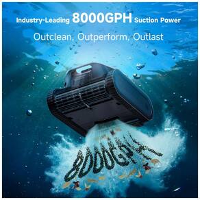 Robô limpa piscina sem fio, controle remoto LiFi, sucção 8000 GPH (30.283 L/h), limpeza horizontal na linha d'água, retorno automático ao ponto de partida, navegação autônoma por sensores, materiais resistentes à corrosão (ABS), filtros de malha fina, bateria Li-ion recarregável (autonomia 90 min), carregador bivolt (110-240V).Tipo de coletor