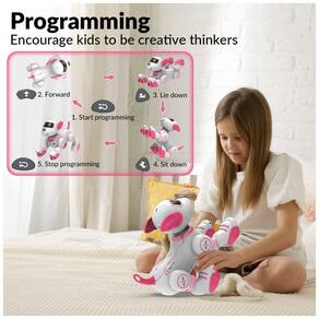 O modo de programação permite registrar sequências de ações, como andar para frente, para trás, virar à esquerda, virar à direita e seguir o usuário, com reprodução na ordem definida pela criança. O robô executa acrobacias predefinidas, incluindo sentar, cumprimentar, apoiar-se nas patas dianteiras, girar e simular flexões, acionadas por botões específicos no controle remoto. Funções de música e dança incluem rotinas com músicas exclusivas e três canções infantis, alternadas pelos botões de dança e canto.