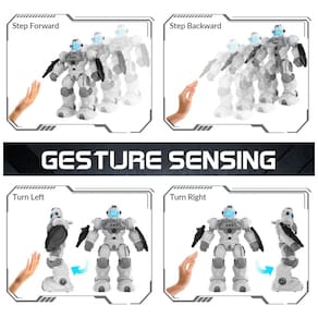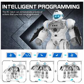 O modo programável permite que a criança registre uma sequência de ações, combinando deslocamentos e animações para reprodução automática. O robô possui repertório de músicas, piadas, músicas ambiente, histórias de ciência e sons de “linguagem de máquina”, ampliando a variedade de conteúdos de áudio disponíveis. A construção em tamanho ampliado, com olhos em LED coloridos, destaca o visual do brinquedo e ajuda a manter a atenção durante o uso.