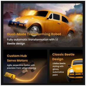 O Robosen Bumblebee Flagship Transformer é um robô colecionável de alta tecnologia que se transforma automaticamente de um Volkswagen Beetle em Bumblebee G1, com controle por voz e aplicativo, 67 microchips e 31 articulações. É uma peça premium para fãs de Transformers e entusiastas de robótica.