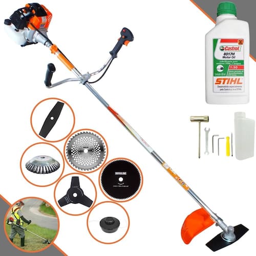 Roçadeira Lateral Vulcan VR430S À Gasolina 2 Tempos 43cc 1,7HP + Faca 3 Pontas 255mm 2,9mm + Faca 40 Dentes 255mm 2mm + Faca 80 Dentes 255mm 2mm + Escova Rotativa 200mm 38 Cerdas + Óleo CASTROL STIHL 500ml