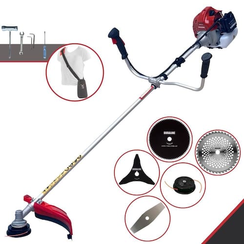 Com guidão ergonômico lateral, permite um alcance amplo e maior mobilidade, capaz de aumentar a produtividade diária. Possui motor 2 tempos á gasolina, de 43 Cilindradas; 1,7HP de potência que proporcionam maior performance e economia na operação. Seu conjunto de acessórios inclui kit de ferramentas, cinto de suporte almofadado, carretel de nylon e lâmina de corte 3 pontas.