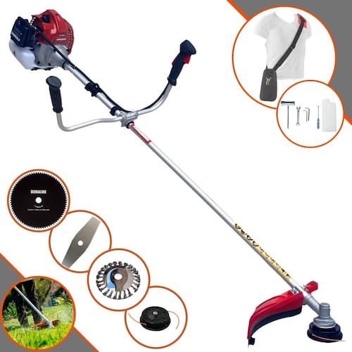 Com guidão ergonômico lateral, permite um alcance amplo e maior mobilidade, capaz de aumentar a produtividade diária. Possui motor 2 tempos á gasolina, de 52 Cilindradas; 2,5HP de potência que proporcionam maior performance e economia na operação. Seu conjunto de acessórios inclui kit de ferramentas, cinto de suporte almofadado, carretel de nylon e lâmina de corte 3 pontas.
