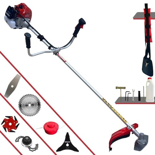 Com guidão ergonômico lateral, permite um alcance amplo e maior mobilidade, capaz de aumentar a produtividade diária. Possui motor 2 tempos á gasolina, de 62 Cilindradas; 3HP de potência que proporcionam maior performance e economia na operação. Seu conjunto de acessórios inclui kit de ferramentas, cinto de suporte almofadado, carretel de nylon e lâmina de corte 3 pontas.