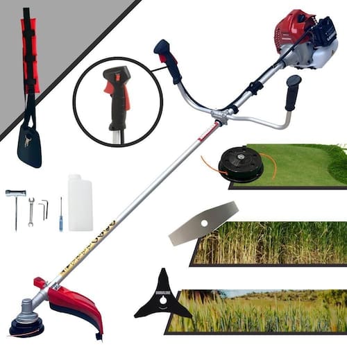 Com guidão ergonômico lateral, permite um alcance amplo e maior mobilidade, capaz de aumentar a produtividade diária. Possui motor 2 tempos á gasolina, de 52 Cilindradas; 2,5HP de potência que proporcionam maior performance e economia na operação. Seu conjunto de acessórios inclui kit de ferramentas, cinto de suporte almofadado, carretel de nylon e lâmina de corte 3 pontas.