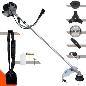 Com guidão ergonômico lateral, permite um alcance amplo e maior mobilidade, capaz de aumentar a produtividade diária. Possui motor 2 tempos á gasolina, de 42,7 Cilindradas, 12.000 de rotação 1,7HP de potência que proporcionam maior performance e economia na operação.Seu conjunto de acessórios inclui kit de ferramentas, cinto de suporte almofadado, carretel de nylon e lâmina de corte 3 pontas.