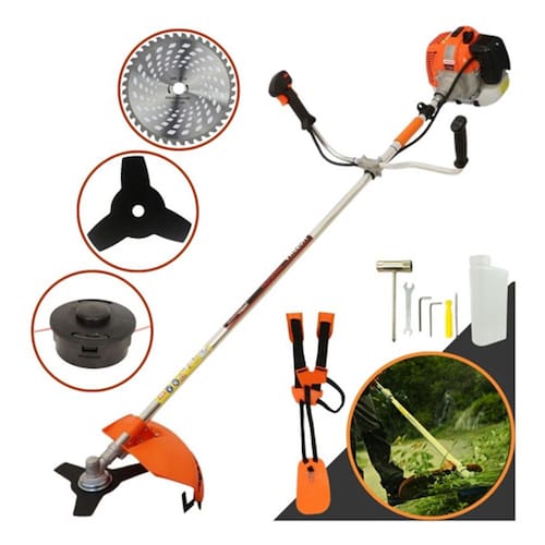 Arranque: Easy Start Tanque: 1200ml Guidão: Bi-Partido Fixado com Suportes parafusados Lâmina: 3 Pontas - 30 cm - Espessura 2mm - Furo 1" Combustível: Gasolina com óleo 2 tempos na proporção 25:1 Carretel: Automático - Libera o fio com um toque no chão Cinto: Duplo com Ombreiras Almofadadas e Fecho Click