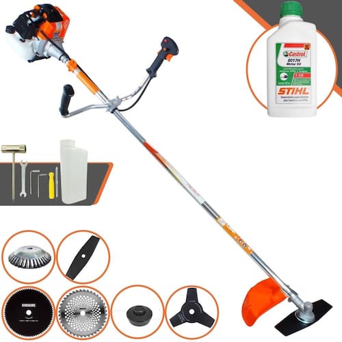 Roçadeira Lateral Vulcan VR430S À Gasolina 2 Tempos 43cc 1,7HP + Faca 3 Pontas 255mm 2,9mm + Faca 40 Dentes 255mm 2mm + Faca 80 Dentes 255mm 2mm + Escova Rotativa 200mm 38 Cerdas + Óleo CASTROL STIHL 500ml