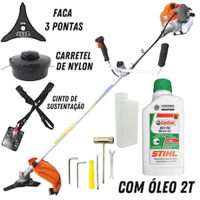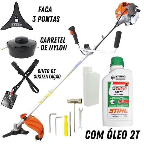 A ROÇADEIRA É DA MARCA VULCAN, E ACOMPANHA UM ÓLEO 2T DA MARCACASTROL STIHL.