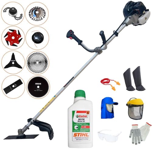 Roçadeira Lateral ANMAX CG430B À Gasolina 2 Tempos 43cc 1,7HP + Faca 3 Pontas 255m + Faca 6 Pontas 250mm + Faca 40 Dentes 255mm + Faca 80 Dentes 255mm + Escova Rotativa 24 cerdas + Trimmer + ÓLEO CASTROL STIHL 500ml + Kit EPI Completo