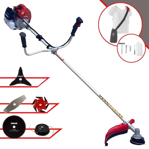 Com guidão ergonômico lateral, permite um alcance amplo e maior mobilidade, capaz de aumentar a produtividade diária. Possui motor 2 tempos á gasolina, de 43 Cilindradas; 1,7HP de potência que proporcionam maior performance e economia na operação. Seu conjunto de acessórios inclui kit de ferramentas, cinto de suporte almofadado, carretel de nylon e lâmina de corte 3 pontas.