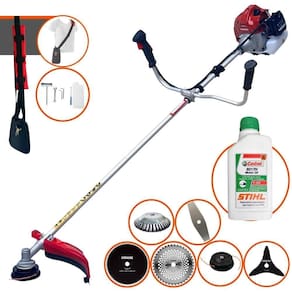 Roçadeira Profissional À Gasolina Kawashima BCJ 431L 42,7CC 1,7HP 2T + Faca 3 Pontas + Faca 40 Dentes + Faca 80 Dentes + Escova 38 Cerdas + Óleo Castrol Stihl 500ml