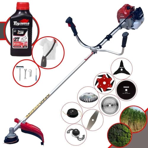 Roçadeira Profissional À Gasolina Kawashima BCJ 431L 42,7CC 1,7HP 2T + Faca 3 Pontas + Faca 6 Pontas + Faca 40 Dentes + Faca 80 Dentes + Trimmer + Escova 38 Cerdas + Óleo Toyama FG50 500ml