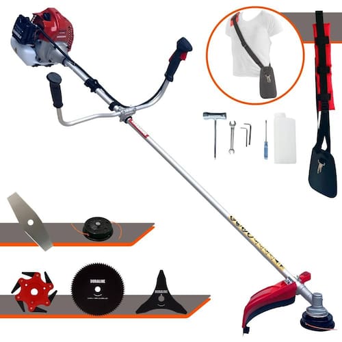 Com guidão ergonômico lateral, permite um alcance amplo e maior mobilidade, capaz de aumentar a produtividade diária. Possui motor 2 tempos á gasolina, de 43 Cilindradas; 1,7HP de potência que proporcionam maior performance e economia na operação. Seu conjunto de acessórios inclui kit de ferramentas, cinto de suporte almofadado, carretel de nylon e lâmina de corte 3 pontas.