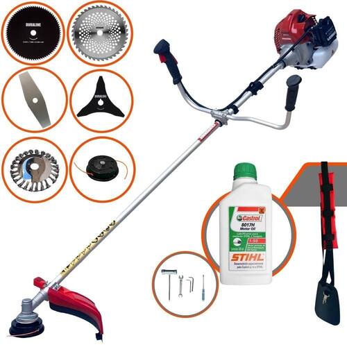Com guidão ergonômico lateral, permite um alcance amplo e maior mobilidade, capaz de aumentar a produtividade diária. Possui motor 2 tempos á gasolina, de 52 Cilindradas; 2,5HP de potência que proporcionam maior performance e economia na operação. Seu conjunto de acessórios inclui kit de ferramentas, cinto de suporte almofadado, carretel de nylon e lâmina de corte 3 pontas.