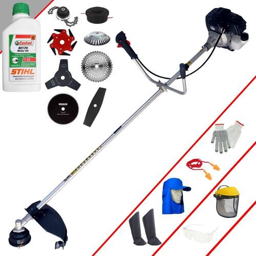 Roçadeira À Gasolina Toyama RT43L-B-25A 43cc 1,7HP 2T Com Lâmina 3 Pontas + Faca 2 Pontas 330mm + Faca 40 Dentes 255mm + Faca 80 Dentes 255mm + Faca 6 Pontas 250mm + Trimmer + Escova Rotativa 200mm 38 Cerdas + Óleo Castrol Stihl 500ml + Kit EPI Completo