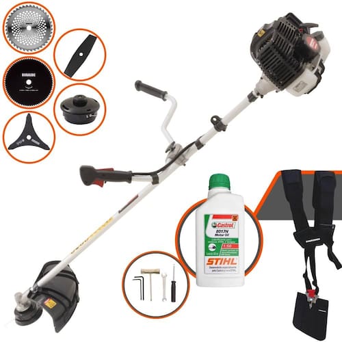 Roçadeira Kawashima KW43-LE À Gasolina 2T 43cc 1,7HP Com Lâmina 3 Pontas + Faca 2 Pontas 330mm 2,7mm+ Faca 40 Dentes 255mm 2mm + Faca 80 Dentes 255mm 1,5mm + ÓLEO CASTROL STIHL 500ml 2 Tempos