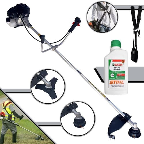 Com guidão ergonômico lateral, permite um alcance amplo e maior mobilidade, capaz de aumentar a produtividade diária. Possui motor 2 tempos á gasolina, de 43 Cilindradas, 10.000 de rotação 1,7HP de potência que proporcionam maior performance e economia na operação. Seu conjunto de acessórios inclui kit de ferramentas, cinto de suporte duplo almofadado, carretel de nylon e lâmina de corte 3 pontas.