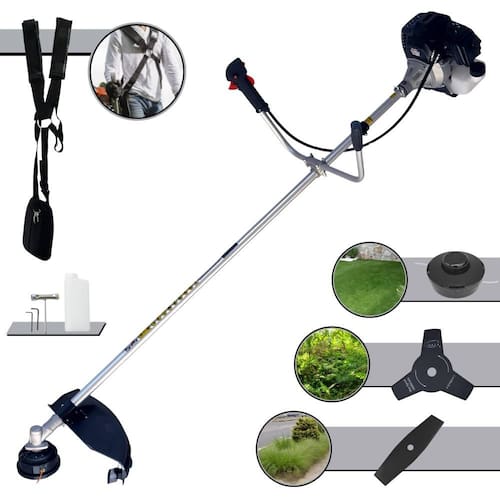 Com guidão ergonômico lateral, permite um alcance amplo e maior mobilidade, capaz de aumentar a produtividade diária. Possui motor 2 tempos á gasolina, de 43 Cilindradas, 10.000 de rotação 1,7HP de potência que proporcionam maior performance e economia na operação.Seu conjunto de acessórios inclui kit de ferramentas, cinto de suporte duplo almofadado, carretel de nylon e lâmina de corte 3 pontas.