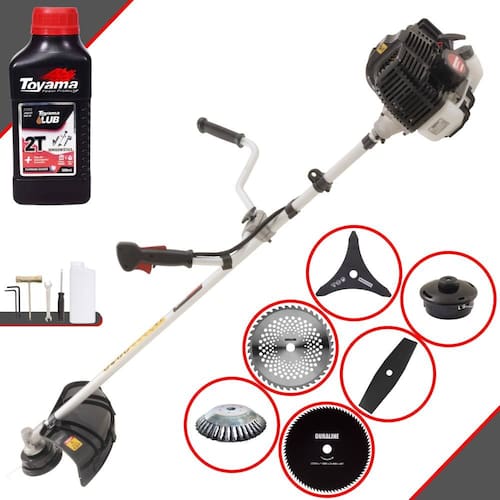 Roçadeira Kawashima KW52LE À Gasolina 2T 52c 2,5HP Com Lâmina 3 Pontas + Faca 2 Pontas 330mm 2,7mm + Faca 40 Dentes 255mm 2mm + Faca 80 Dentes 255mm 1,5mm + Escova Rotativa 38 Cerdas 200mm + Óleo TOYAMA LUB FG50 500ml 2T