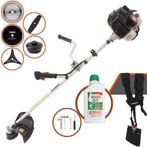 01: Lâmina 2 Pontas; 01: Lâmina 3 Pontas; 01: Lâmina 40 Dentes; 01: Lâmina 80 Dentes; 01: Óleo Castrol Stihl 2T 500ML; 01: Carretel de fio de nylon; 01: Cinto de sustentação duplo; 01: Misturador de combustível; 01: Kit de ferramentas; 01: Manual de Instruções;