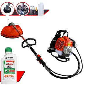 Possui motor 2 tempos á gasolina, de 43Cilindradas, 1,7HP de potência que proporcionam maior performance e economia na operação.Seu conjunto de acessórios inclui kit de ferramentas, cinto de suporte duplo almofadado, carretel de nylon e lâmina de corte 40 Dentes.