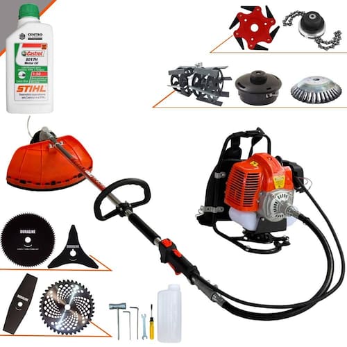 Possui motor 2 tempos á gasolina, de 43Cilindradas, 1,7HP de potência que proporcionam maior performance e economia na operação.Seu conjunto de acessórios inclui kit de ferramentas, cinto de suporte duplo almofadado, carretel de nylon e lâmina de corte 40 Dentes.