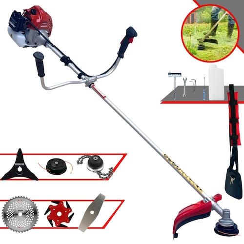 Com guidão ergonômico lateral, permite um alcance amplo e maior mobilidade, capaz de aumentar a produtividade diária. Possui motor 2 tempos á gasolina, de 43 Cilindradas; 1,7HP de potência que proporcionam maior performance e economia na operação. Seu conjunto de acessórios inclui kit de ferramentas, cinto de suporte almofadado, carretel de nylon e lâmina de corte 3 pontas.