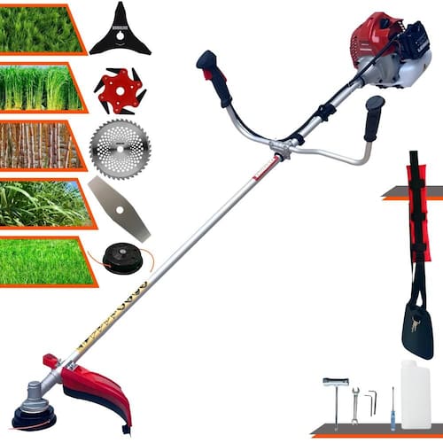Com guidão ergonômico lateral, permite um alcance amplo e maior mobilidade, capaz de aumentar a produtividade diária. Possui motor 2 tempos á gasolina, de 52 Cilindradas; 2,5HP de potência que proporcionam maior performance e economia na operação. Seu conjunto de acessórios inclui kit de ferramentas, cinto de suporte almofadado, carretel de nylon e lâmina de corte 3 pontas.