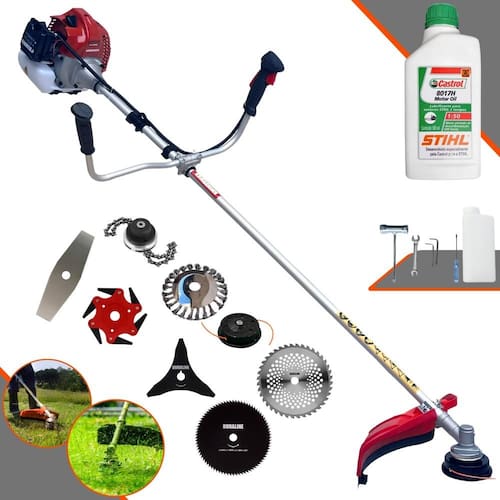 Roçadeira À Gasolina Kawashima BCJ 521L 52CC 2,5HP 2T + Faca 3 Pontas + Faca 40 Dentes + Faca 80 Dentes + Escova Rotativa 24 cerdas + Trimmer + Faca 6 Pontas + Óleo Castrol Stihl 2T 500ml